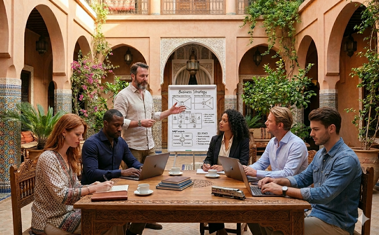 Une retraite entrepreneuriale immersive de 7 jours à Marrakech pour transformer ton idée en un projet structuré, cohérent et prêt à être testé.