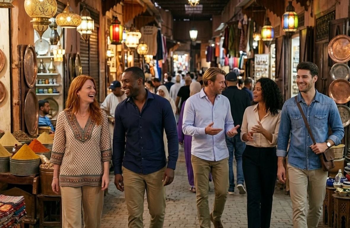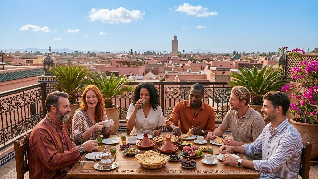 Libre. Marrakech t'appartient — dîner dans la médina, thé à la menthe dans un riad, ou simplement continuer les conversations stratégiques autour d'un repas avec les autres entrepreneurs du groupe.